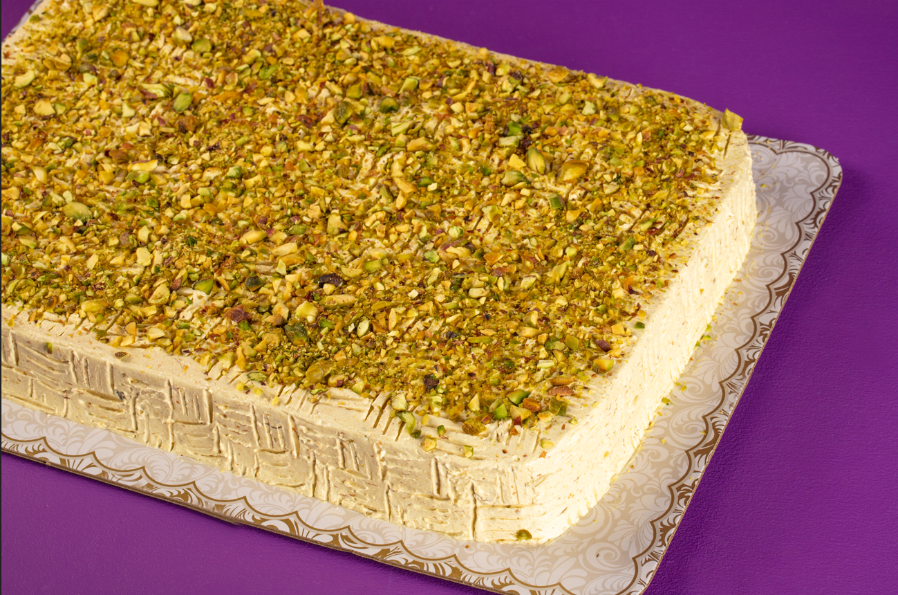 The cake that started it all—a light, no-sugar-added chiffon cake topped with a smooth, buttery frosting of fresh avocados and finished off with chopped pistachios.